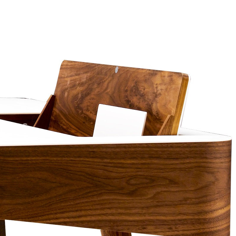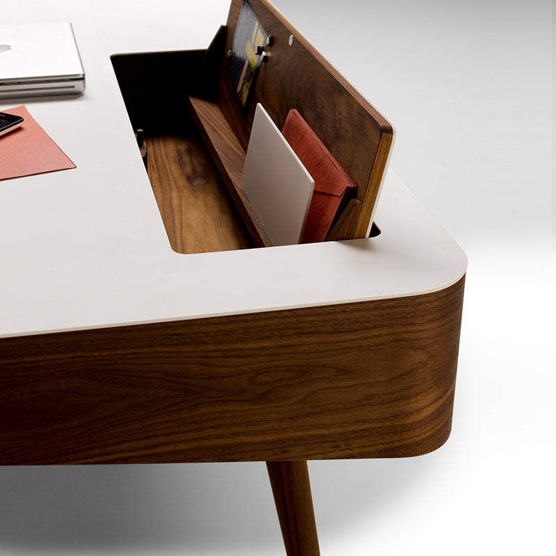 Beautiful and functional desk designed by the architect Ebbe Gehl. The tabletop is white Dupont Corian® with a flap which hides a room for storage. The inside of the flap is a magnetic noticeboard for notes and messages. Further it is possible to hide electrical wiring for Laptop, I-pad and mobile inside the room. In the drawers there is space for Laptop or I-pad and in the left drawer you will find a pen tray.
