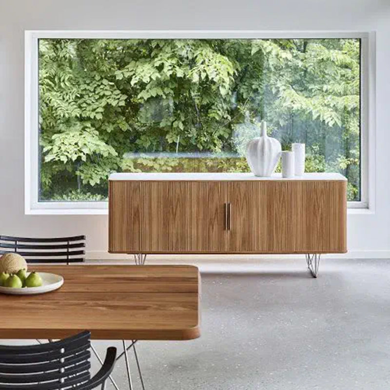AK 2730 is a classic sideboard that has been given a modern twist with a Corian top and handle as well as a stainless steel base. The combination of the soft shapes of the jalousie doors and the light frame results in an elegant sideboard that fits into many of the home's rooms.